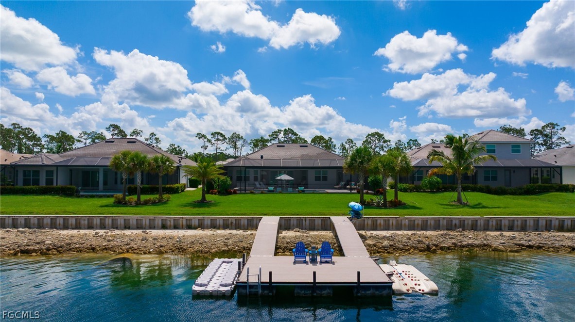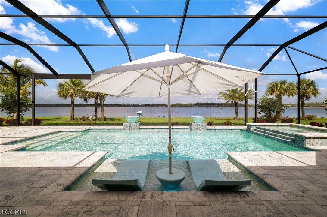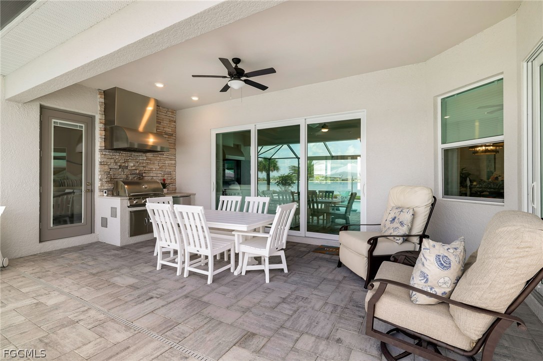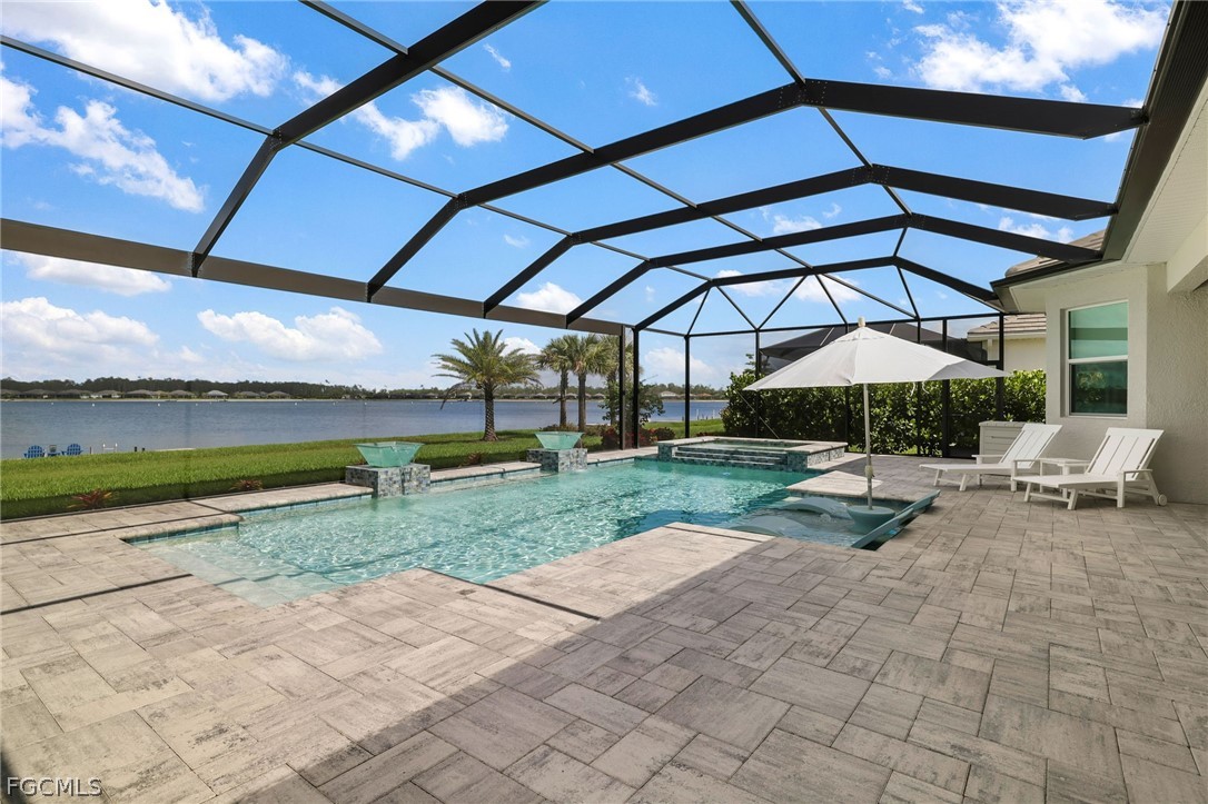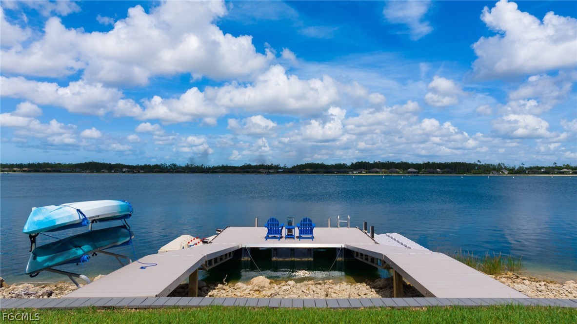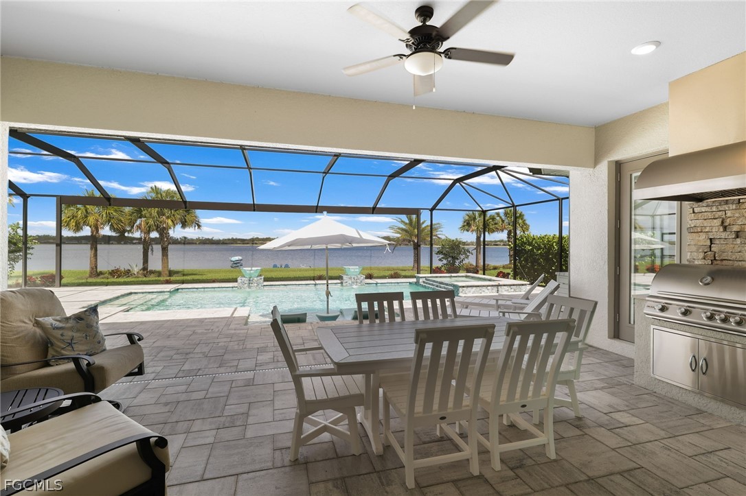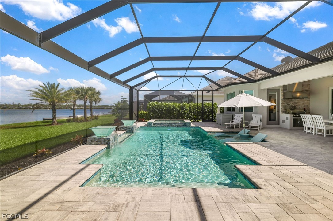 Your lakefront sunset oasis awaits at 13880 Blue Bay Cir! Experience captivating western-facing views over the mile-wide boatable Lake Vista from this stunning open-concept design with three bedrooms plus a den, two and a half bathrooms, and nearly 2400sqft under air. Every inch of this home has been crafted to provide a luxury lake home feel. The second you open the front door you are greeted by an expansive great room, large island kitchen, and massive windows and sliding glass doors looking over the pool and lake. Separate from the rest of the bedrooms, the master suite is a true retreat, with a bedroom, sitting area, walk-in closet, bright and spacious bathroom, and a private door to the lanai. The remarkable outdoor space is complete with an outdoor kitchen, paver deck with a poured concrete base and tons of space for furniture, a custom heated pool and waterfall spa, and a picture window screen cage. Your lot will be the envy of the lake, with mile-wide sunset-facing lake views and no homes across the street for unparalleled privacy. Additional notable upgrades include impact windows and doors, a whole-home generator, Hinckley light fixtures and fans, automatic motorized window shades on the sliding glass doors, custom blinds and draperies, porcelain plank tile throughout the home, shaker style soft close cabinetry, quartz countertops and backsplash, a dock with kayak racks and jet ski floats, and more. WildBlue's amenity peninsula provides panoramic views of WildBlue Lake and features a resort-style pool, separate lap pool, sandy lakeside beach, fitness center with studios, locker rooms with saunas, spa, a full-service restaurant and bar, poolside bar and grill, tennis and pickleball courts, a pro shop, basketball, boat ramps to over 800 acres of freshwater lakes, boat slip rentals, kayak storage, and more. Schedule your private showing today; see you at the lake!