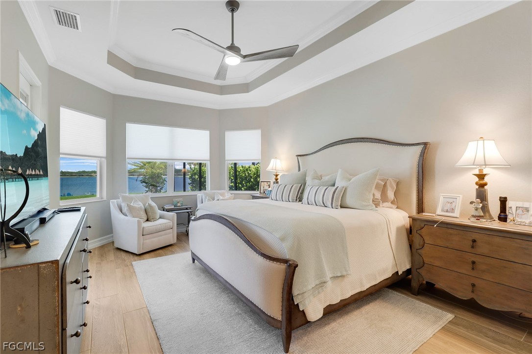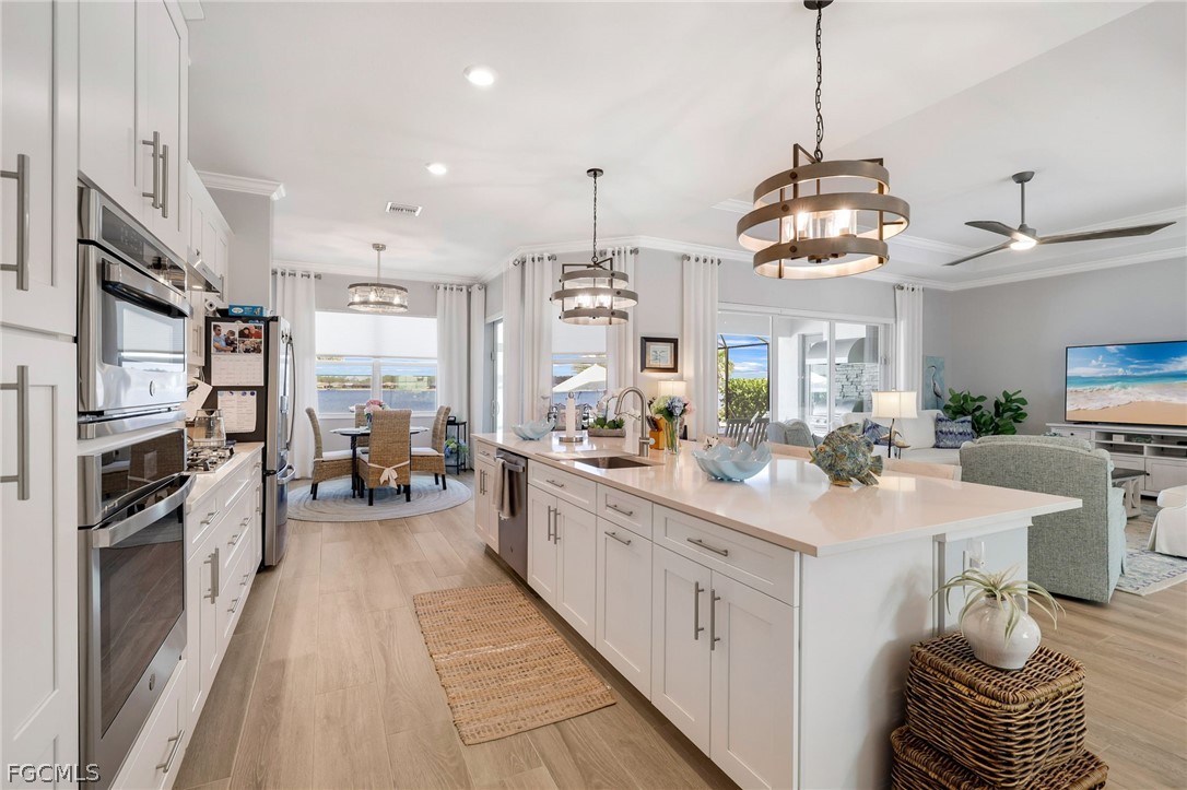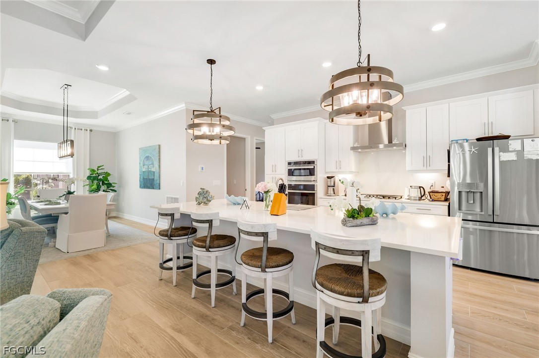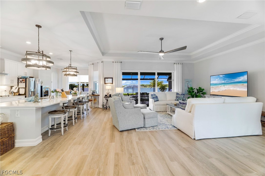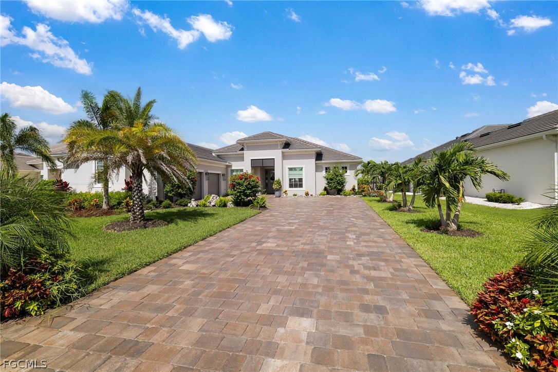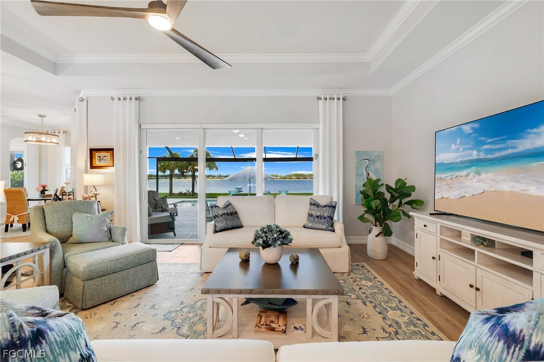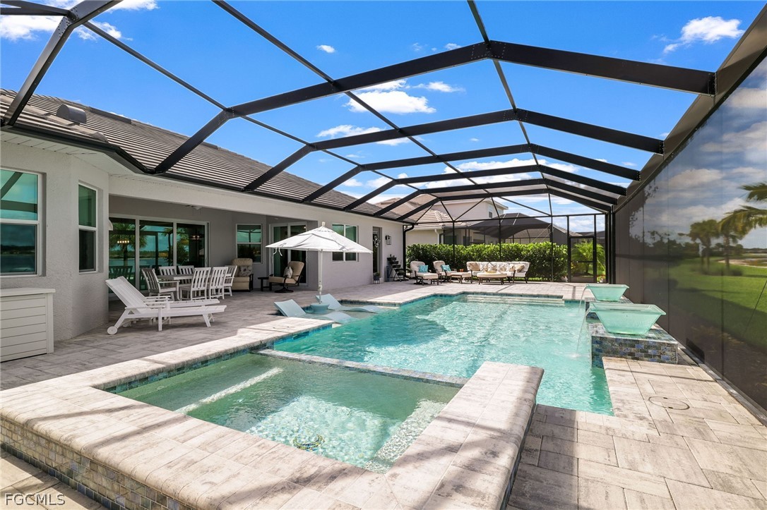 Your lakefront sunset oasis awaits at 13880 Blue Bay Cir! Experience captivating western-facing views over the mile-wide boatable Lake Vista from this stunning open-concept design with three bedrooms plus a den, two and a half bathrooms, and nearly 2400sqft under air. Every inch of this home has been crafted to provide a luxury lake home feel. The second you open the front door you are greeted by an expansive great room, large island kitchen, and massive windows and sliding glass doors looking over the pool and lake. Separate from the rest of the bedrooms, the master suite is a true retreat, with a bedroom, sitting area, walk-in closet, bright and spacious bathroom, and a private door to the lanai. The remarkable outdoor space is complete with an outdoor kitchen, paver deck with a poured concrete base and tons of space for furniture, a custom heated pool and waterfall spa, and a picture window screen cage. Your lot will be the envy of the lake, with mile-wide sunset-facing lake views and no homes across the street for unparalleled privacy. Additional notable upgrades include impact windows and doors, a whole-home generator, Hinckley light fixtures and fans, automatic motorized window shades on the sliding glass doors, custom blinds and draperies, porcelain plank tile throughout the home, shaker style soft close cabinetry, quartz countertops and backsplash, a dock with kayak racks and jet ski floats, and more. WildBlue's amenity peninsula provides panoramic views of WildBlue Lake and features a resort-style pool, separate lap pool, sandy lakeside beach, fitness center with studios, locker rooms with saunas, spa, a full-service restaurant and bar, poolside bar and grill, tennis and pickleball courts, a pro shop, basketball, boat ramps to over 800 acres of freshwater lakes, boat slip rentals, kayak storage, and more. Schedule your private showing today; see you at the lake!